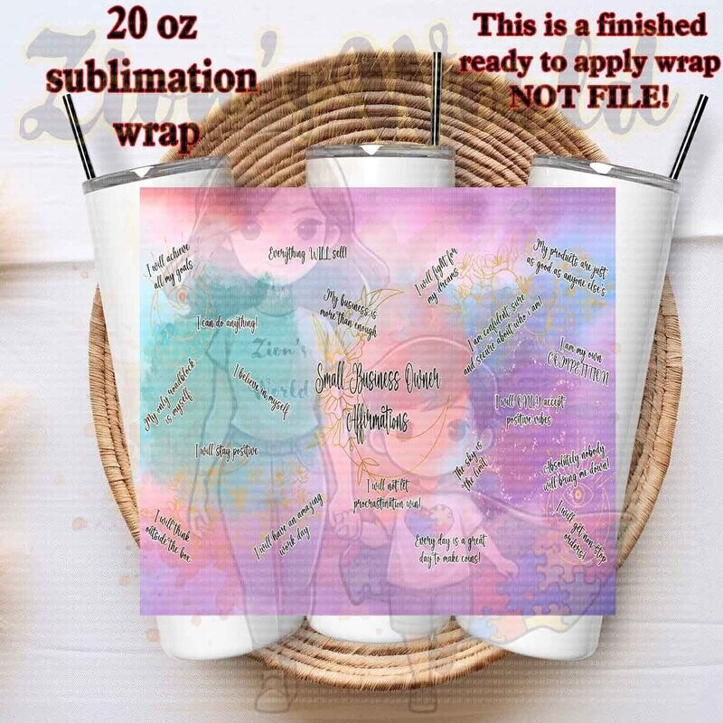 Wraps are sized for 20oz stainless steel tumbler. Application instructions listed below are to be used as a point of reference only. Temperature and time settings may differ depending on which sublimation heat press or convectional oven you use.